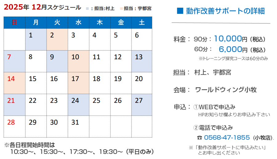 会員様向けトップトレーナーの各サポートの12月の開催日程を共有させていただきます。(休会中の方はご利用いただけませんので予めご了承ください。)