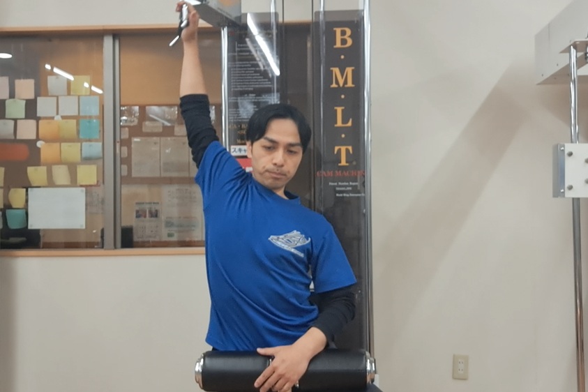 さらに固まりやすい横腹、体側の動きを引き出すには、腕が耳より後ろにある状態で上に上がっていく状態をつくる、ということが大事になります。