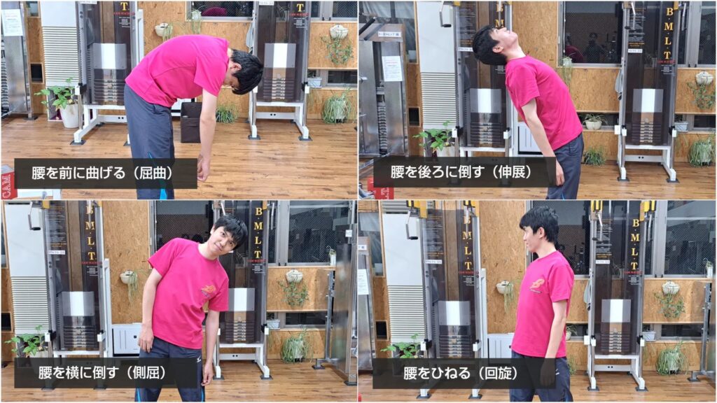 前に曲げる、後ろに反る、横に倒す、ひねる。